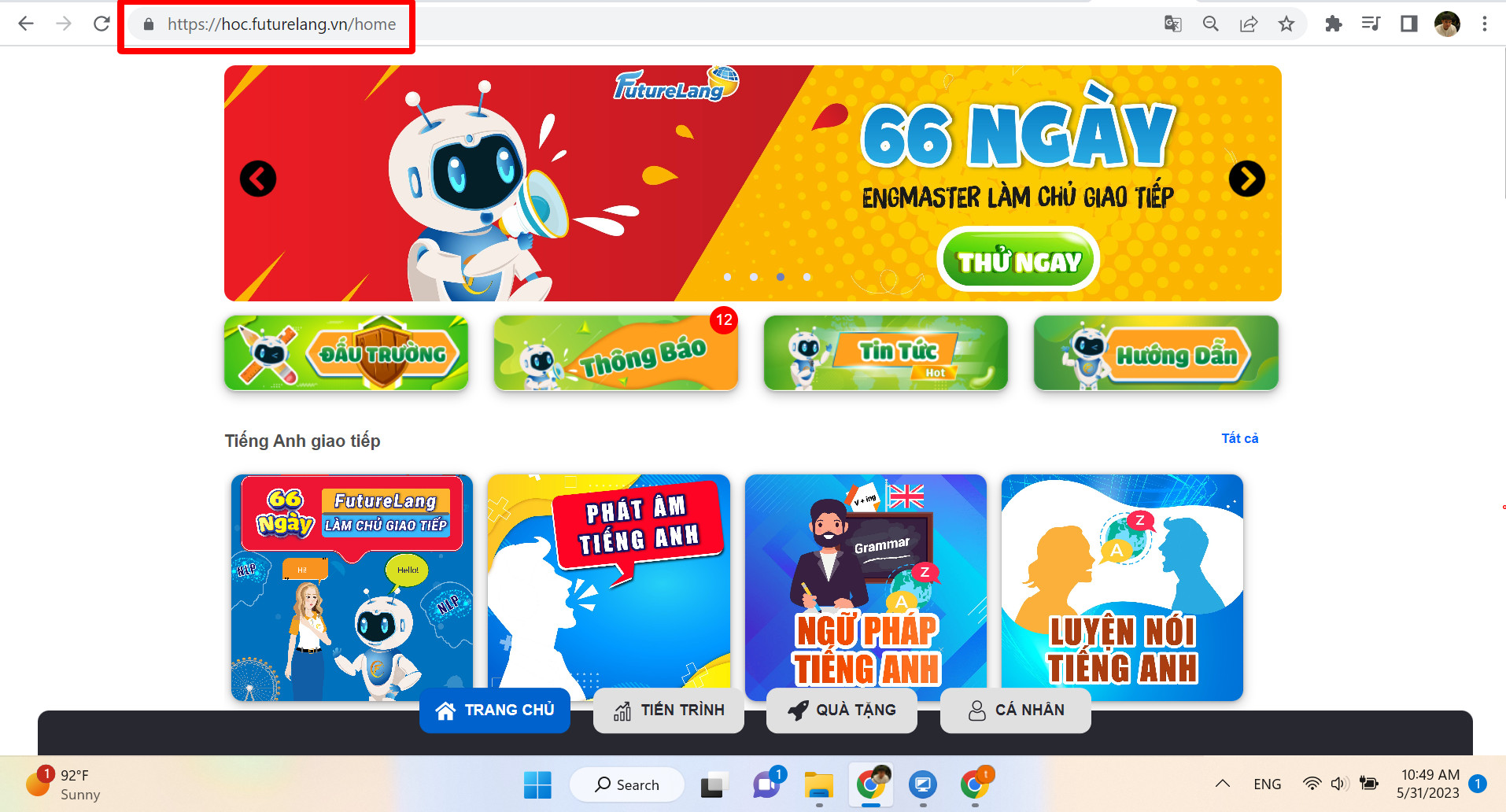 Bước 1 :Truy cập website: Hoc.futurelang.vn bằng trình duyệt chorme