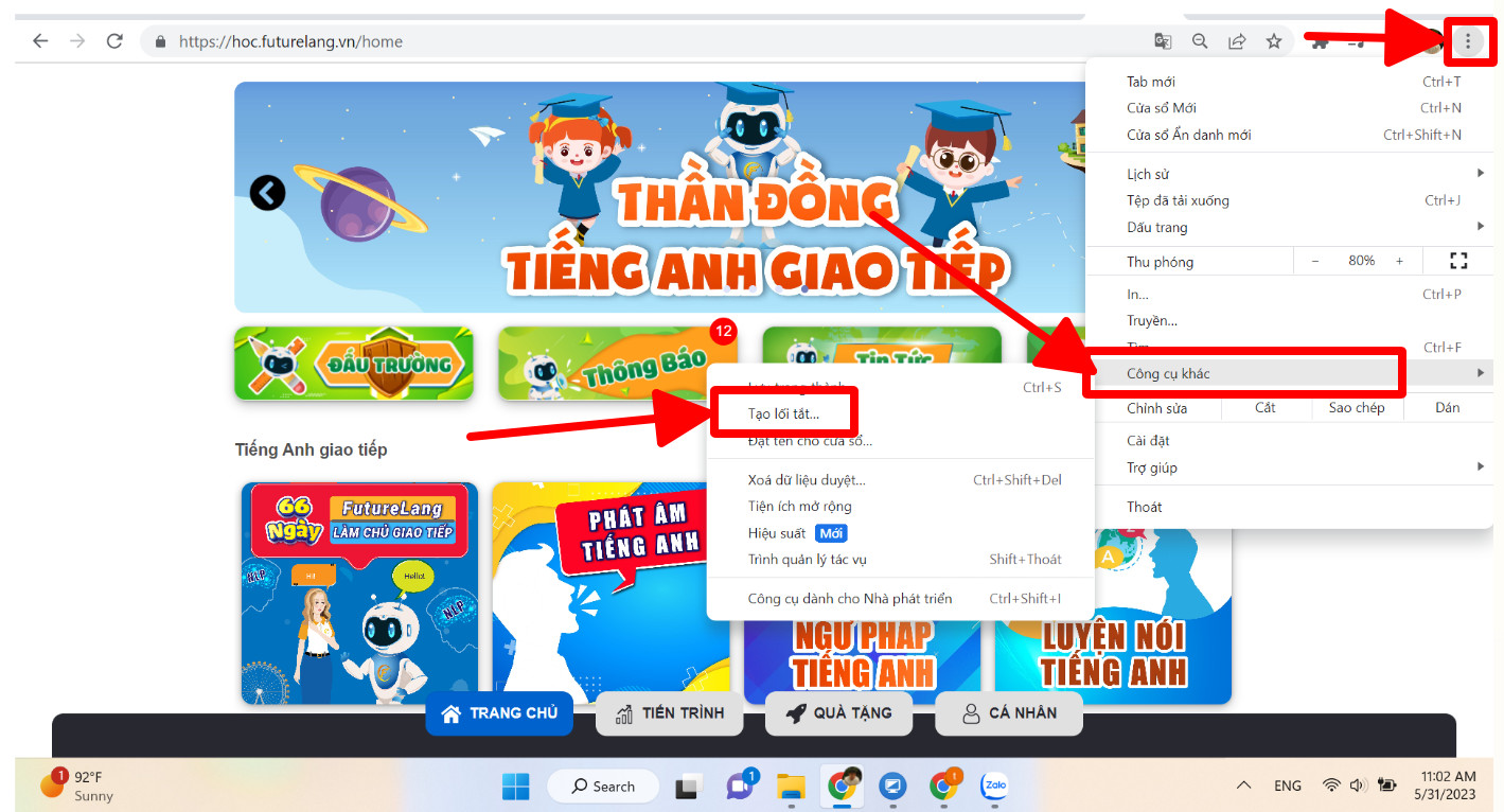 Bước 2 : Trên góc phải thanh công cụ chọn dấu “3 chấm” thẳng sau đó chọn “Công Cụ Khác” rồi chọn “Tạo lối tắt”